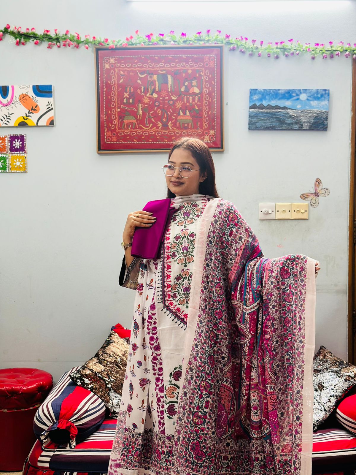 Printed embroidered lawn front.Printed lawn back & sleeves. Printed cambric trouser. Organza embroidered patti. Printed chiffon dupatta.