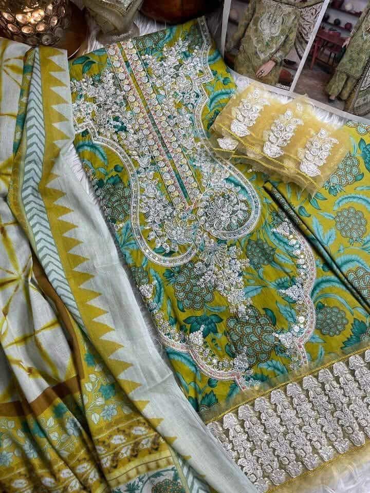 Printed embroidered lawn front.Printed lawn back & sleeves. Printed cambric trouser. Organza embroidered patti. Printed chiffon dupatta.