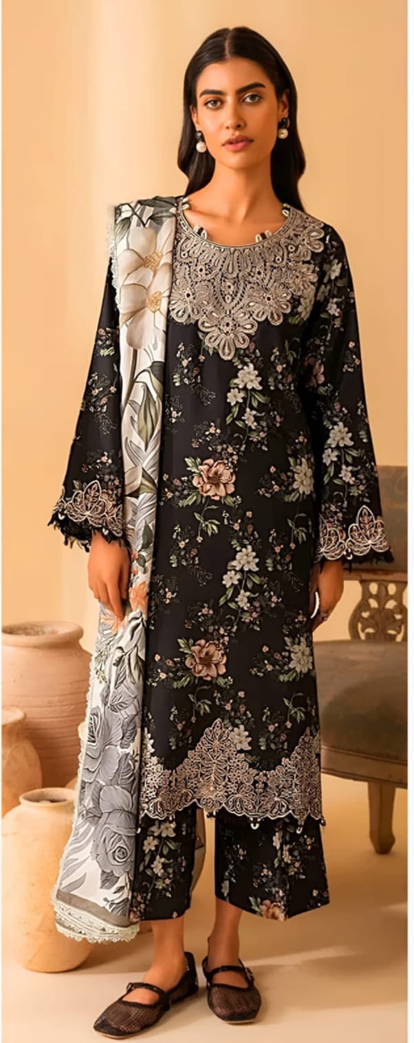 Printed linen front, back & sleeves. Embroidered neck patch. Embroidered daman border.Salwar one colour cotton. Dupatta digital print cotton chicken kari cut work